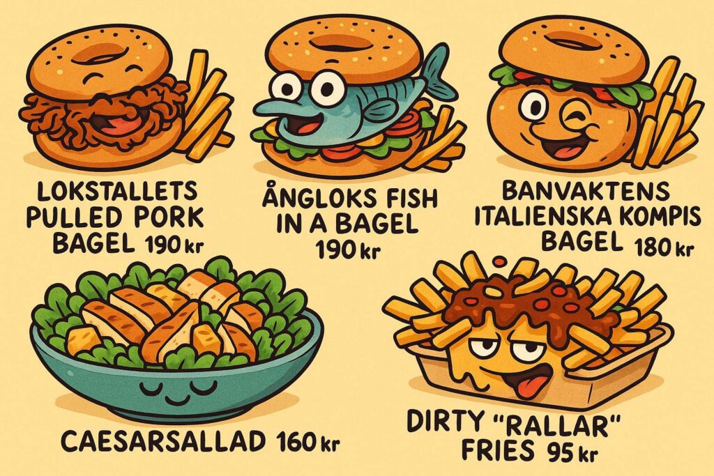 – Banvaktens italienska kompis bagel + pommes – 180 kr